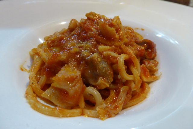 同行者の、豚肉とキャベツのトマトソース。麺はキタッラ。茹でると少し太くなる。トマトソースにはこれくらいの太麺がよく合う。豚肉は、食感からホルモン系も混ざってるのかな。はっきりしなかったけど、美味しかった。