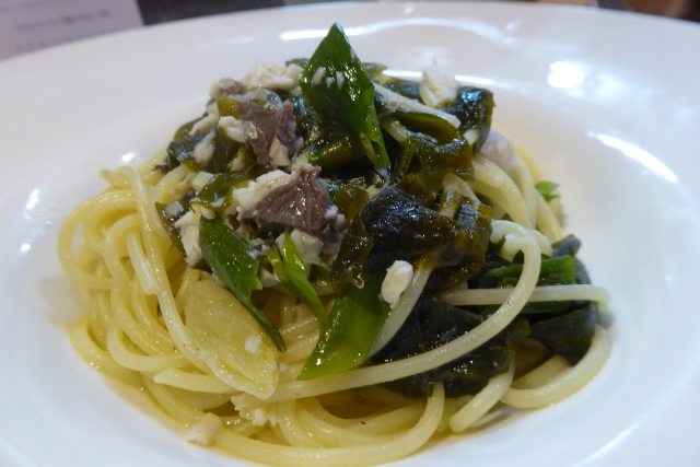 島根産サワラと下津井産ワカメのパスタ。オイル仕立てで、ほどよい塩分が暑い日のランチにぴったり。