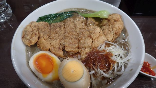 スパイシーで独特のカリッとした衣をまとった排骨(パーコー)に鬼ぼしスープがしゅみて美味い。平打ち麺とのからみもよくて一気にすすり上げたわ。味付固ゆで玉子と半熟卵の組み合わせは珍しいね。