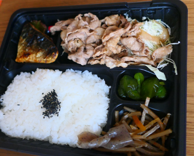 鯖の焼き具合は絶妙、薄めの豚スライスに合わせた淡い味付けで、生姜風味のタレが効いている。やや甘めのきんぴらとでバランス吉。米は県内産コシヒカリ。炊きたてでホッコリして弁当ってやはり米だなぁと思わせる逸品。